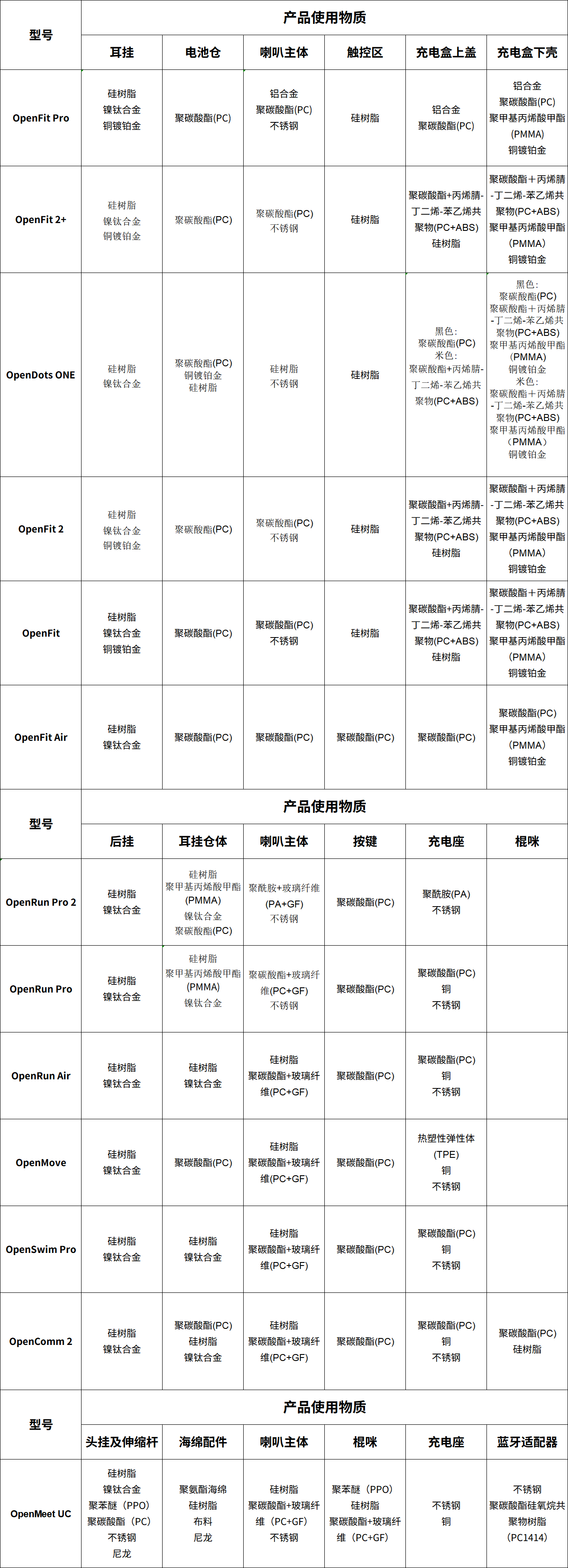 Shokz产品所适用的材料符合国际的相关标准。除规定的限制物质以外,我们持续、广泛与认证机构合作,针对产品进行了严格地测试,以确保用户的安全。 如果您对以下物质有过敏反应,请谨慎使用本产品,注意预防发生皮肤问题: